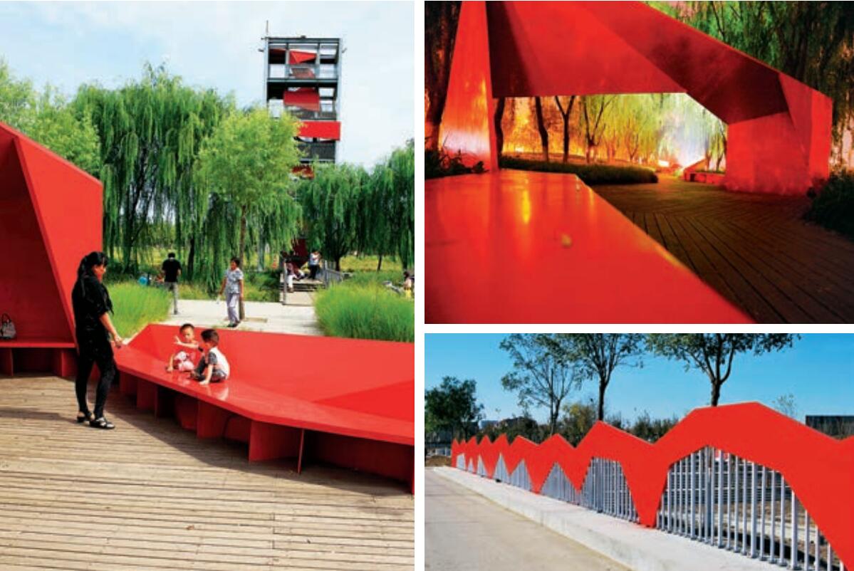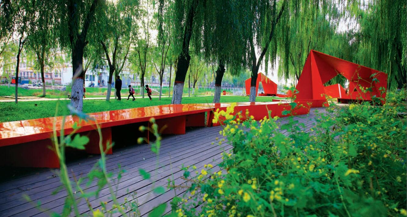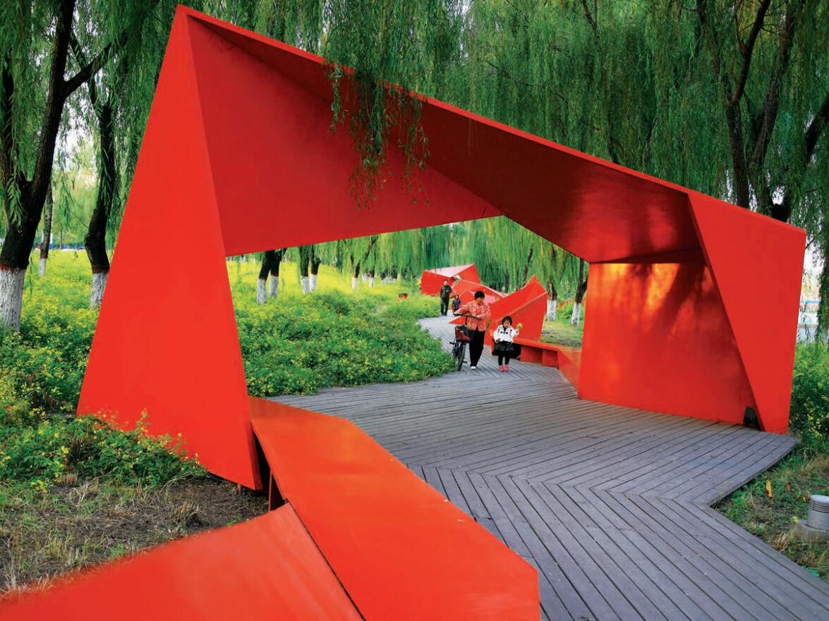 本項(xiàng)目位于河北省遷安市東部的河?xùn)|區(qū)三里河沿岸。三里河為遷安的母親河,承載著遷安的悠遠(yuǎn)歷史與尋常百姓的許多記憶。受當(dāng)?shù)刂募艏埶囆g(shù)的啟發(fā),一段 800 米長(zhǎng)的紅色折紙走廊貫穿于本項(xiàng)目的中心地帶。曲曲折折地安設(shè)于原河畔上的柳樹下,使得構(gòu)筑物、座椅、木板路和照明成為一個(gè)整體,實(shí)現(xiàn)集合觀賞、休憩娛樂、遮陽(yáng)擋雨等多種功能。這些中國(guó)紅藝術(shù)品是由復(fù)合材料制成的,不但完美呈現(xiàn)了折紙的靈動(dòng)造型,柔和的外表面也更具親和力,可以讓人們親密體驗(yàn)折紙文化。