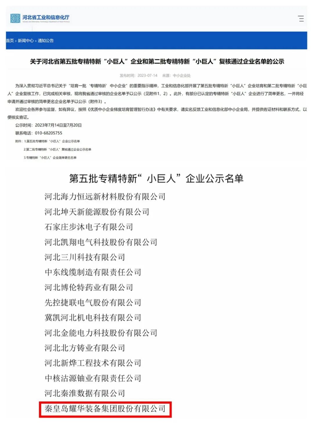 2023年7月14日,河北省工業(yè)和信息化廳發(fā)布了《關(guān)于河北省第五批專精特新“小巨人”企業(yè)和第二批專精特新“小巨人”復(fù)核通過企業(yè)名單的公示》,秦皇島耀華裝備集團(tuán)股份有限公司入選國家級專精特新“小巨人”企業(yè)。