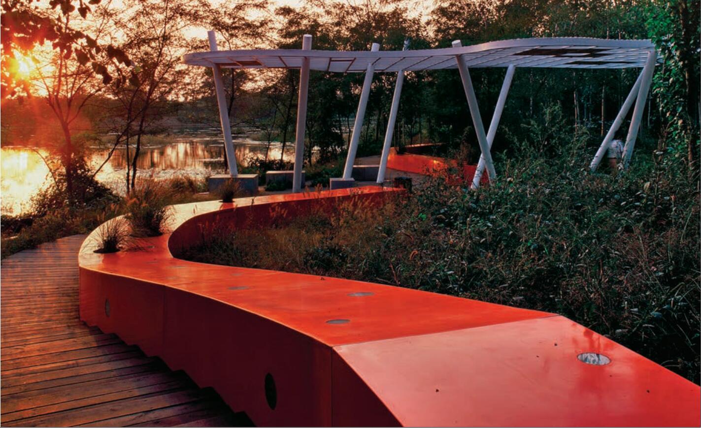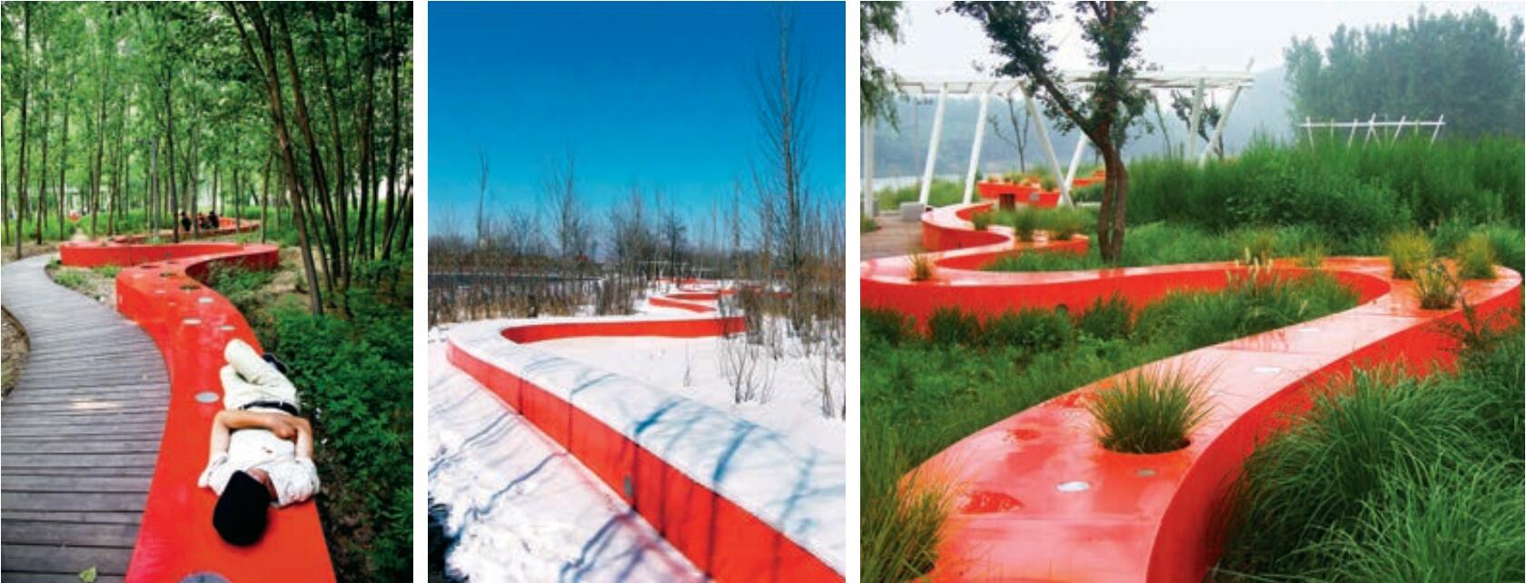 本項(xiàng)目為秦皇島市大湯河兩岸景觀改造工程中的重點(diǎn)景觀雕塑,是集觀賞、照明和休憩功能于一體的大型復(fù)合材料裝飾景觀,其形狀宛如一條紅色的飄帶沿河舞動(dòng),將沿河綠化帶裝點(diǎn)得分外妖嬈。項(xiàng)目全長(zhǎng)約 600 余米,寬度 600 ~ 1800 毫米之間。紅飄帶主體采用復(fù)合材料和型鋼,經(jīng)由專用模具里加工成型。其表面設(shè)有綠化池、頂燈、側(cè)燈孔 , 內(nèi)部有照明裝置。