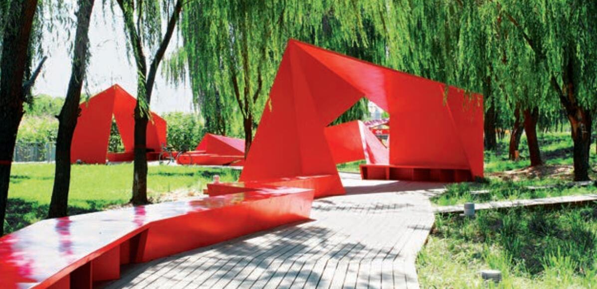 本項(xiàng)目位于河北省遷安市東部的河?xùn)|區(qū)三里河沿岸。三里河為遷安的母親河,承載著遷安的悠遠(yuǎn)歷史與尋常百姓的許多記憶。受當(dāng)?shù)刂募艏埶囆g(shù)的啟發(fā),一段 800 米長(zhǎng)的紅色折紙走廊貫穿于本項(xiàng)目的中心地帶。曲曲折折地安設(shè)于原河畔上的柳樹下,使得構(gòu)筑物、座椅、木板路和照明成為一個(gè)整體,實(shí)現(xiàn)集合觀賞、休憩娛樂、遮陽(yáng)擋雨等多種功能。這些中國(guó)紅藝術(shù)品是由復(fù)合材料制成的,不但完美呈現(xiàn)了折紙的靈動(dòng)造型,柔和的外表面也更具親和力,可以讓人們親密體驗(yàn)折紙文化。